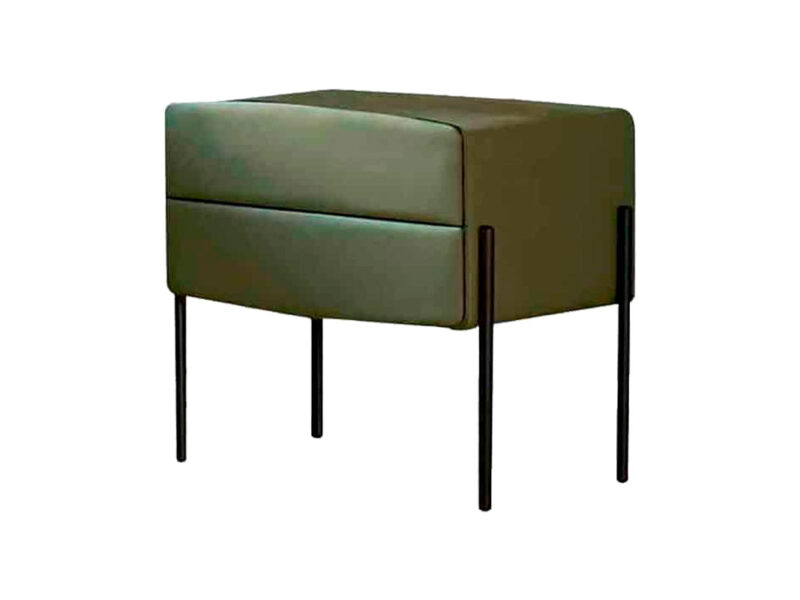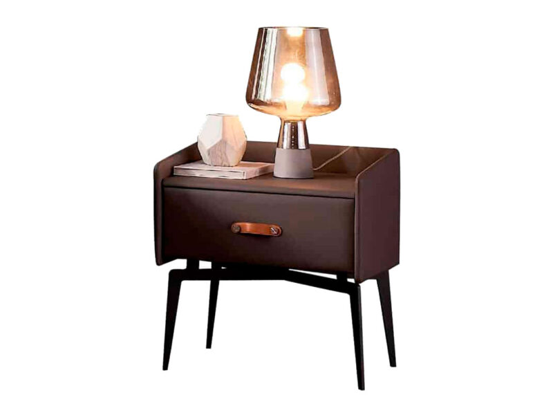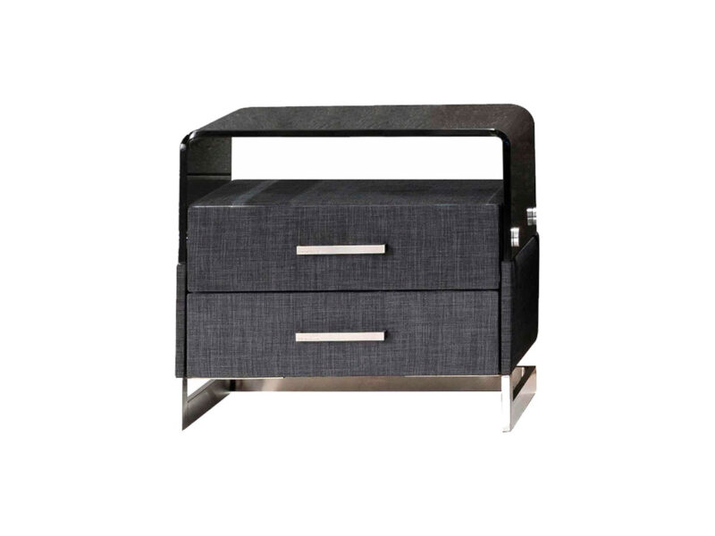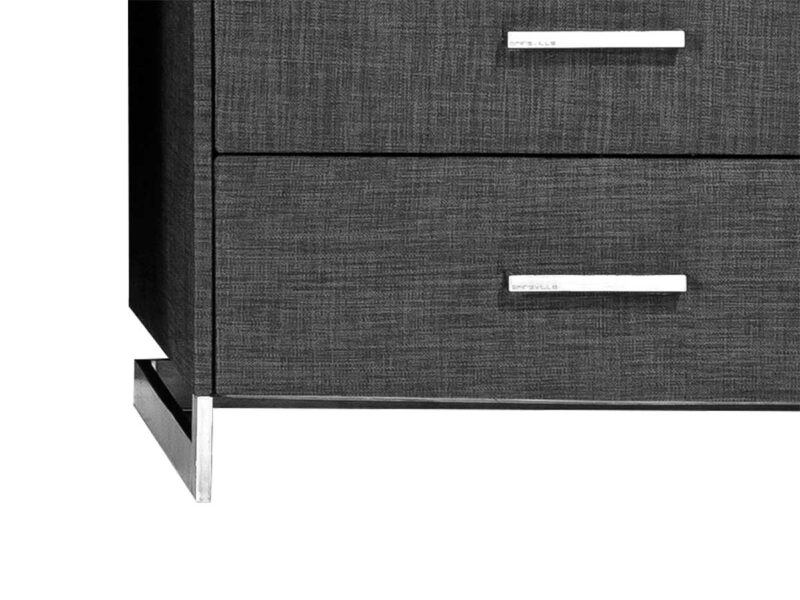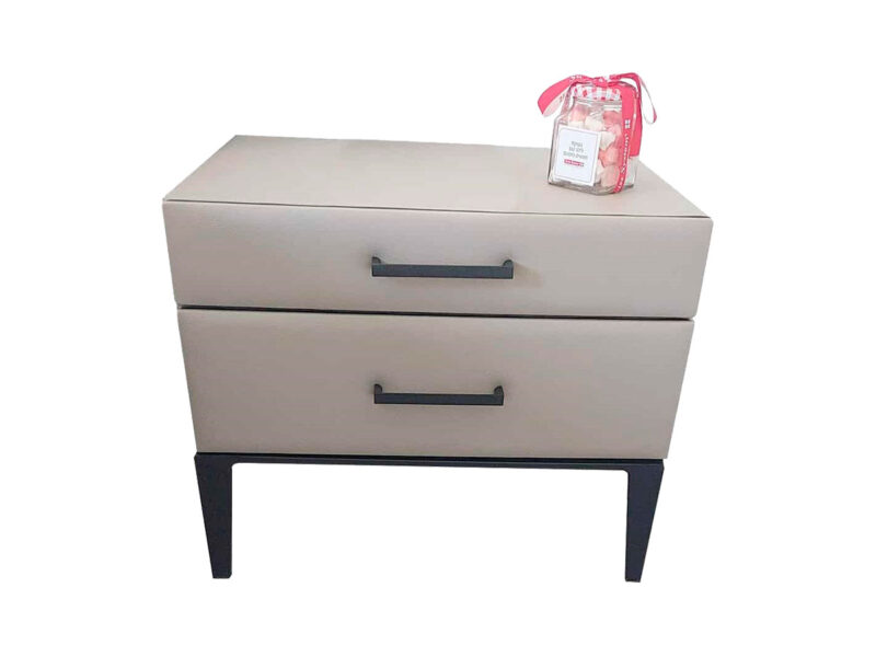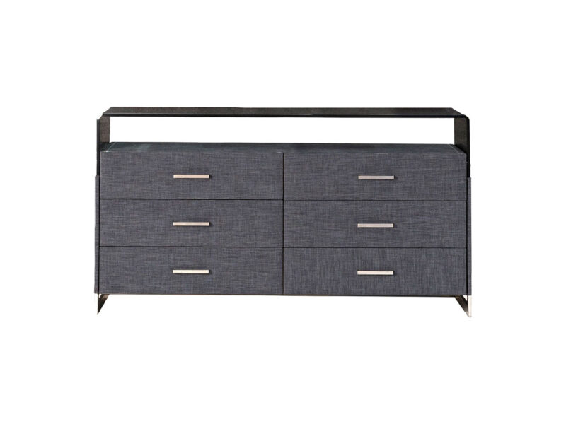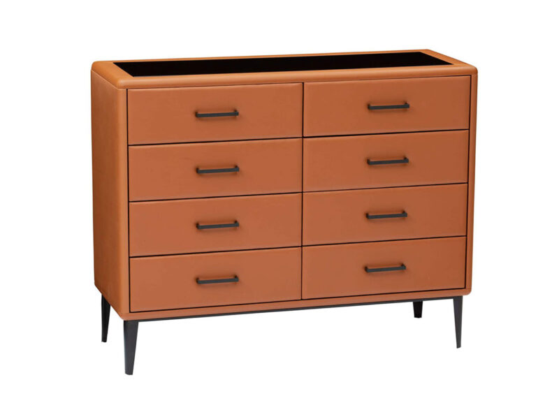 קומודה לחדר שינה דגם לוציאנו. הקמודה מצופה עור בקווים עדינים המשתלבים בצורה הרמונית בכל חלל. חלקה העליון מחולק לחלק פנימי ובו לוח זכוכית בצבע שחור (כאשר עור מצפה את השוליים החיצוניים).