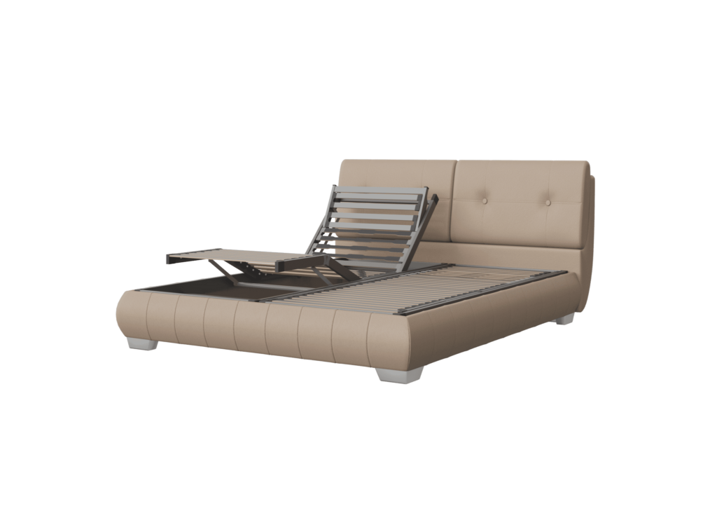 מיטה מתכווננת דגם דניש מאופיינת במראה נקי, זוג כריות בגימור כפתורי טפטינג, המיטה עוצבה על ידי Matthias Rossow מעצב הבית של “רופ ביטן גרמניה”.