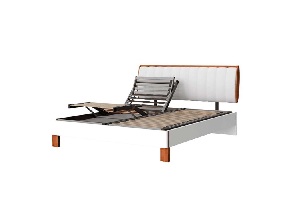מיטה מתכווננת מדגם פייר בנארד מבית המותג הצרפתי KINWAY עוצבה על ידי Francine & Fabrice Leduc ומשלבת בין עץ מלא לצביעה אפוקסית וריפוד PU.